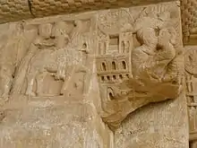 Escena que muestra a Favila a caballo, con un halcón en la mano, despidiéndose de su esposa Froiluba con un beso (izquierda), antes de salir a cazar y de morir en un enfrentamiento con un oso.[1]