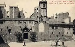 La iglesia original era de una sola planta de cruz griega. El espacio estaba delimitado por cuatro arcos soportados por columnas y cubierto por una cúpula de base octogonal. En la parte en la que se sitúa la actual capilla del Santísimo se pueden ver restos de la antigua iglesia de San Saturnino. La decoración mural de las bóvedas de esta capilla es del pintor muralista Felip Vall, del 1945. [5] [6]El monasterio tenía un campanario, conocido como la Torre dels Ocells (la Torre de los Pájaros) que fue destruida durante el incendio de 1909. Este campanario convivió desde 1752 con el actual campanario octogonal, que posee 6 campanas.