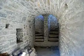 Todavía se alza una estructura de la iglesia inferior, a la cual se accede a través de un pasadizo abovedado que se halla bajo la nave central, por lo que parece que esta era una cripta y había otra nave encima al estilo como la que se encuentra en Samitier. La nave se comunica con el pasadizo por una puerta con arco de medio punto peraltado.