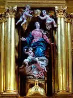 La portada es de estilo plateresco, con escudo de los Velasco y una imagen de la Inmaculada.