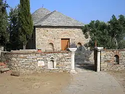 El catholicon del monasterio está dedicado a San Nicolás (Nicolás de Bari) y es el más pequeño de todos los de los monasterios del Monte Athos. Fue construido en el siglo XVI sobre una iglesia preexistente dedicada al Theotokos. Está decorado con frescos y un iconostasio del famoso pintor de iconos de la "escuela de Crera" Theophanes Strelitzas (también conocido como Theophanes el cretense) y su hijo Symeon. El refectorio está situado en el piso superior del ala sur del complejo y también alberga importante iconografía.