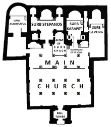 El complejo del monasterio estaba compuesto por la iglesia principal, dedicada a la Santa Cruz (Surb Khach) y cuatro capillas al este: Surb Astvatsin (Santa Madre de Dios), Surb Stepanos (San Esteban), Surb Karapet (Santo Precursor) y Surb Gevorg (San Jorge). La iglesia principal no era una típica iglesia armenia, sino una gran sala. Se cree que originalmente funcionaba como un zhamatun (cámara). Fue construida en su mayor parte con piedras grises y estaba sostenida por 16 columnas. Las capillas de Surb Karapet y Surb Stepanos tenían cúpulas, con "altos tambores cilíndricos y techos cónicos".[5] La capilla de Surb Astvatsin fue proporcionada a los monjes asirios en la fiesta de San Juan.[54]