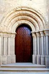 Construcción original de finales del siglo XII pero reformada en siglos posteriores, presenta un muro exterior de doble alzado. En el muro norte o del Evangelio se abre una portada románica abocinada con tres arquivoltas de medio punto, la exterior ornamentada con labra floral, que descansa en columnas acodilladas con capiteles decorados con motivos vegetales geometrizados. El arco interior de ingreso apea en pares de columnas adosadas similares a las anteriores; se trata de un primitivo elemento arquitectónico muy restaurado.