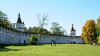 - Las murallas de piedra con sus siete torres (1690–1694) fue diseñada por Yakov Bukhvostov, un defensor clave del barroco Naryshkin.