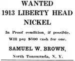 En diciembre de 1919, llegó la primera información de que una Liberty Head de 1913 podría haber sido acuñada cuando el coleccionista de monedas, Samuel W. Brown, puso anuncios en publicaciones numismáticas, ofreciendo cualquiera de estas monedas para su compra. En agosto de 1920, Brown expuso dicha moneda en la convención anual de la Asociación Americana de Numismática (AAN).[35] Allí desveló que se había preparado un troquel maestro para la moneda Liberty Head de 1913, además de que se había sacado unas pocas tiradas para probarlo.[36] Cuando se produjo, Brown tenía cinco de estas monedas, las cuales vendió finalmente. Tras pasar quince años en las manos del excéntrico coronel Edward Howland Robinson Green, el coleccionista más famoso en la zona de Fort Worth (Texas), las monedas acabaron dispersándose en 1943. Desde entonces, han tenido varios propietarios cada una. Actualmente, una de ellas se encuentra en exposición en el Instituto Smithsoniano de Washington y otra en el Museo del Dinero de la AAN en Colorado Springs, mientras que las otras tres están en manos de propietarios privados. La venta más reciente de una Liberty Head de 1913 fue en enero de 2010 por 3.737.500$.[37]