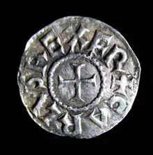 - Esta obra contiene una traducción derivada de «Aachen penny of Charlemagne» de Wikipedia en inglés, publicada por sus editores bajo la Licencia de documentación libre de GNU y la Licencia Creative Commons Atribución-CompartirIgual 3.0 Unported.