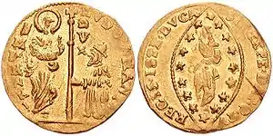 En 1284, en Venecia, produjeron una moneda de oro, que en peso replicaba florín florentino, con una apariencia original.[11][12] En el anverso se representaba a Cristo en mandorla, un halo de óvalo que enmarca la figura de Cristo; en el reverso, de rodillas se encontraba el Dux, recibiendo de manos de San Marcos la bandera.[10] La leyenda circular de la moneda reza: Sit tibi Christe datus, quem tu regis iste ducatus, lo que dio lugar a la aparición del nombre «ducado». Fue el tipo más común de moneda veneciana llamado también zecchino, que se mantuvo sin cambios desde la primera acuñación, en 1284, hasta la última, durante el reinado del último dux de Venecia en 1796, Ludovico Manin.[13] Incluso las emisiones emitidas por los austriacos, en nombre del emperador Francisco II, usaron los mismos tipos.[5]