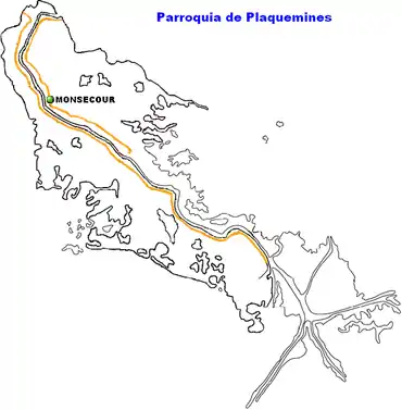 Localización de Monsecour en el mapa de la Parroquia de Plaquemines.