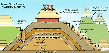 Los amerindios de Estados Unidos construyeron montículos de subestructura durante más de mil años a partir del periodo arcaico y continuando a través del Periodo silvícola o Woodland. Muchas culturas arqueológicas diferentes como por ejemplo la Cultura misisipiana del este de Norteamérica son bien conocidas específicamente por el uso de montículos como un aspecto central de sus prácticas generales de religión y creencias. Estos montículos de plataforma son en general en forma de pirámide truncada, de cuatro lados empinados, con escalones construidos de troncos de madera en un lado de los terraplenes. Cuando los europeos llegaron por primera vez a América del Norte, los pueblos de la cultura misisipiana continuaban utilizando y construyendo montículos de plataforma. Los usos documentados para los montículos misisipianos incluyen la plataforma semipública de la casa del jefe de la tribu, las plataformas públicas del templo, plataformas mortuorias, plataformas de osarios, plataformas para residencias de la casa de campo / casa de la ciudad, plataformas cuadradas y redondas, y las plataformas de danza.[1]