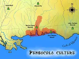 El sitio fue ocupado entre 1250 y 1550, y sirvió como punto focal para la interacción con otras áreas de la cultura misisipiana a lo largo de la costa y el interior del sureste de los Estados Unidos. Se encuentra en Mound Island en el delta del río Mobile-Tensaw, al norte de la actual Mobile, e incluye 18 montículos de plataforma, el más alto 45 pies (13,7 m) de alto. Cinco de esos dieciocho montículos están puestos alrededor de la plaza central. Era el cacicazgo misisipiano más grande en la costa norte-central del Golfo. Es difícil llegar a pie; sin embargo, habría sido de fácil acceso en canoas, el principal medio de transporte de los pueblos de la región. Se encuentra cerca de la confluencia de los ríos Tombigbee y Alabama. Los arroyos se convierten en un laberinto de ramas y pantanos en la cabecera de la Bahía de Mobile. El sitio era un centro ceremonial para la gente de Pensacola, así como un centro social, político, religioso y comercial para la región del Delta del Mobile-Tensaw y de la costa central del Golfo.[1]