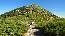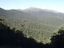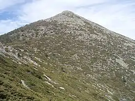 ![]() Vertiente sur del Montón de Trigo vista desde Cerro Minguete. La montaña, vista desde el norte o desde el sur, tiene una forma que hace alusión a su nombre. | ||