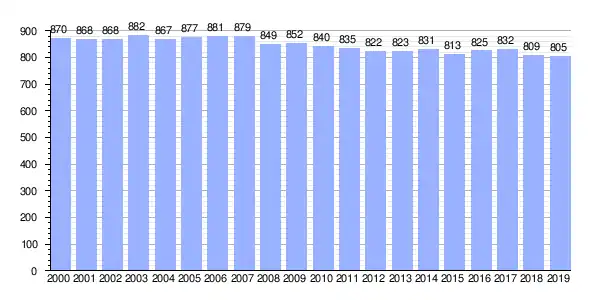 Gráfica de evolución demográfica de Montaos entre 2000 y 2019 |
