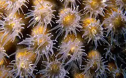 Contienen algas simbióticas mutualistas (ambos organismos se benefician de la relación), llamadas zooxantelas. Las algas realizan la fotosíntesis produciendo oxígeno y azúcares, que son aprovechados por los pólipos, y se alimentan de los catabolitos del coral (especialmente fósforo y nitrógeno).[5] Esto les proporciona entre el 70 y el 95% de sus necesidades alimenticias. El resto lo obtienen atrapando plancton y materia orgánica disuelta en el agua.