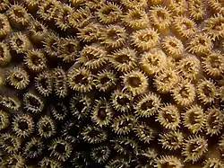 Su esqueleto es macizo y está compuesto de carbonato cálcico. Tras la muerte del coral, su esqueleto contribuye a la generación de nuevos arrecifes en la naturaleza.