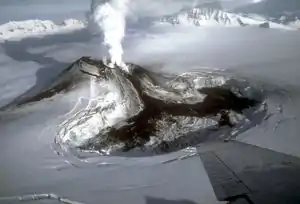 El vapor se eleva desde el cono de ceniza intracalderica en el volcán Veniaminof en las etapas menguantes de la erupción de 1983 a 1984.