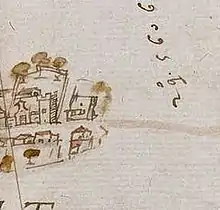 En el plano realizado en 1628 a instancias del Conde-Duque de Olivares se observa en su actual emplazamiento, una torre almenada hoy desaparecida.[2]