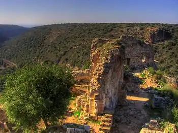 Montfort se encuentra en un afloramiento rocoso conocido como al-Qurayn[4] "el Cuerno" en un valle regado por el Wadi Qurayn "río del Cuerno" en árabe y Nahal Keziv[5] en hebreo.
