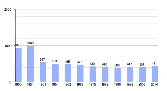 Los datos demográficos contemplados en este gráfico de la comuna de Montgardon[4] se han cogido de 1800 a 1999 de la página francesa EHESS/Cassini, y los demás datos de la página del INSEE.[5]