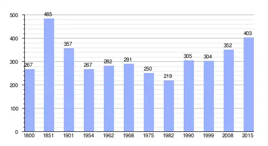 Los datos demográficos contemplados en este gráfico de la comuna de Montgaroult[4]se han cogido de 1800 a 1999 de la página francesa EHESS/Cassini, y los demás datos de la página del INSEE.[5]