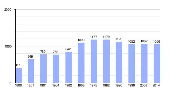 Los datos demográficos contemplados en este gráfico de la comuna de Montmoreau-Saint-Cybard[4] se han cogido de 1800 a 1999 de la página francesa EHESS/Cassini, y los demás datos de la página del INSEE.[5]
