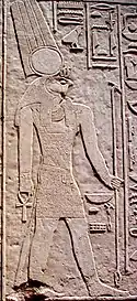 Fue representado como hombre con cabeza de halcón, coronado con el disco solar, dos plumas y dos uraeus. Armado con un arco y un hacha. A veces, con cabeza de toro, coronado por el disco solar y dos plumas.