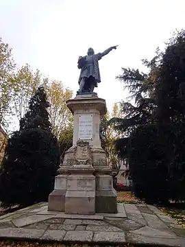 Muestra al descubridor sobre un pedestal, con un globo terráqueo en las manos y a sus pies las cartas de navegación. El pedestal es también posee en un lateral un medallón con Fray Diego de Deza, en otro lado muestra la imagen de Isabel I de Castilla.