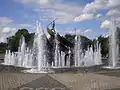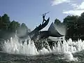 Presenta un barco de pesca levantado por la aleta de una ballena. Representa cuatro figuras de balleneros con remos en un bote abierto, con arpones listos y rociando agua. Está hecho al estilo de una rosa de los vientos y gira lentamente. Las partes centrales están hechas de bronce y pesan 26 toneladas. Las columnas de agua en la fuente son reguladas a diferentes alturas. La piscina tiene 128 luces submarinas. Alrededor de la fuente hay relieves estilizados en granito de la caza de ballenas moderna.[7][8][9]