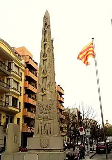 Es una pirámide de sección triangular con representaciones de tres “castells”: un 4 de 9 sin “folre”, un “pilar” de 6 y un 2 de 7, con una anchura en la base de 2 m, 1,5 m y 1 m respectivamente. El peso aproximado de la pirámide es de 25 toneladas de piedra arenisca y la altura es de 11,7 m. La base tiene 4 caras, con los escudos de las provincias catalanas. Encima tiene un panel independiente de la pirámide, con un alto relieve representando a los “grallers” (músicos). Detrás está el escudo de Valls. La altura de esta base és de 2,40 m que, sumados a los de la pirámide dan una altura total de 14,6 m.[1]