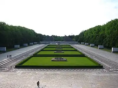 Un ancho y ligeramente creciente bulevar, bordeado por sauces a lo largo del camino central, lleva al eje principal de la instalación. Está marcado por dos grandes banderas estilizadas de granito rojo, inclinadas a ambos lados del camino. El mármol utilizado en su construcción fue extraído de la demolida Cancillería del Reich de Adolf Hitler. Al tope de estas dos estructuras se observa una escultura de bronce de un soldado arrodillado con uniforme, armado con una metralleta y con su casco en la mano. El soldado del lado derecho es un poco más joven que el del lado izquierdo. De aquí a pocos pasos se llega hasta el cementerio simbólico, que es el centro de la planta. Comienza con césped y pequeños arbustos plantados por las tumbas; son cinco bloques cuadrados, cada uno con una corona de laureles de bronce (la tumba real se encuentra, sin embargo, a los lados de los bloques, bajo los árboles y bajo el montículo).