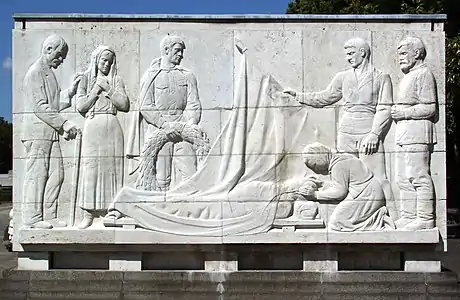 En la inauguración del monumento conmemorativo soviético en el Parque de Treptow, el 8 de mayo de 1949, cuarto aniversario del final de la guerra, Otto Grotewohl, uno de los copresidentes del SED y más tarde primer ministro, fundador ese mismo año la República Democrática Alemana, dedicó el monumento en agradecimiento a los soldados soviéticos que entregaron sus vidas.[9] Como jefe de la delegación alemana terminó su discurso con estas palabras: