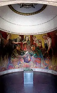 Los últimos dos sarcófagos que están dedicados a la muerte heroica, se ubican en una línea que limita con el montículo artificial, en el que se encuentra la base cónica con la monumental escultura de "El Libertador Soviético" del escultor Yevgueni Vuchétich, que domina el horizonte del monumento.