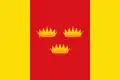 Bandera rectangular de proporciones 2:3, formada por tres franjas verticales en proporciones 1/4, 1/2 y 1/4, siendo amarillas las exteriores y roja la central con tres coronas de infanzón amarillas puestas dos y una.
