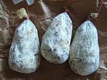 El embolsado se hace a mano, cosiendo la cubierta alrededor de la masa. En la parte inferior del salume se adhiere un tralcetto (trozo de vid) que envuelve la cuerda durante la relajación debido a la curación.