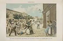 Paralelamente otro grupo quemó la caseta de los consumos (el lugar donde los funcionarios municipales, “burots”, cobraban los odiados impuestos de entrada de mercancías a la ciudad) y a continuación dirigidos por el conocido liberal Manuel Rivadeneyra intentaron atacar el convento de San Francisco, pero solo consiguieron quemar las puertas. Ya entrada la noche varios grupos incendiaban seis conventos: el de los trinitarios descalzos –donde hoy está el Liceo-, el de San José de los carmelitas descalzos –donde hoy se encuentra el mercado de La Boquería-, el de los agustinos en la calle del Hospital, el de los carmelitas calzados de la calle del Carmen, el de San Francisco de Paula de los mínimos, en la calle de Sant Pere, y el de los dominicos de Santa Catalina –donde hoy se encuentra el mercado del mismo nombre-. Fueron atacados otros edificios religiosos, pero sin llegar a ser incendiados, como en el caso del seminario de San Vicente de Paul de la calle Amalia, donde frailes y seminaristas consiguieron hacer frente a los asaltantes con garrotes y armas de fuego.[16] Los asaltos a estos conventos en algunos casos se hicieron al mismo tiempo por lo que fueron obra de grupos diferentes. Muchos frailes escaparon y fueron recogidos por el ejército y la milicia urbana que los trasladó al castillo de Montjuic, pero otros no lo consiguieron y 16 de ellos fueron asesinados.[17]