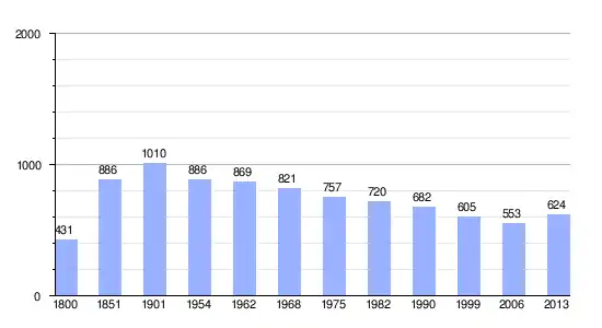 Los datos demográficos contemplados en este gráfico de la comuna de Moutiers-sous-Argenton[4] se han cogido de 1800 a 1999 de la página francesa EHESS/Cassini, y los demás datos de la página del INSEE.[5]