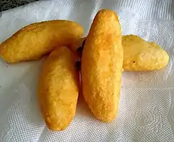 Se cocina la yuca con sal por 30 minutos aproximadamente. Una vez cocinada, se amasa con yema de huevo y se le da forma ovalada, se le coloca un relleno de queso y cebolla picada y se la fríe en aceite caliente hasta quedar dorada.[2][3]