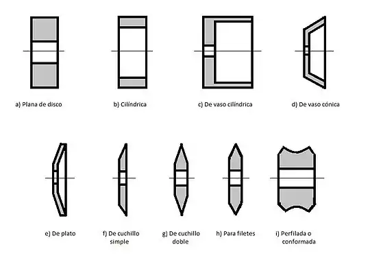 Existen variedad de formas de las muelas para el rectificado, cada una con un uso específico. Para rectificar superficies cilíndricas se emplean la a) y la b), para el rectificado plano se emplean las muelas de la forma c), para el afilado de herramientas se emplea la d), para afilar herramientas también y sierras se emplea la e), para desbardar fundiciones se emplean la f) y la g), la h) como su nombre indica para rectificar filetes de roscas y finalmente la i) para rectificar perfiles o dar formas.