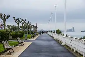 - La segunda parte está constituida por un paseo ajardinado, y se extiende más allá de la playa. Es el muelle propiamente dicho, es decir, la obra levantada por Evaristo de Churruca, que permitió el encauce del Nervión. Está constituido por dos paseos peatonales, separados por varias zonas ajardinadas, y que conectan en una pequeña plazoleta final, en la que se levanta un pequeño faro. Al principio del muelle se encuentra el monumento a Evaristo de Churruca, un enorme obelisco que representa al hombre luchando y venciendo al mar (representado por Neptuno, el dios romano, en una posición de derrota). Con esta imagen se simboliza la lucha del hombre contra el mar.[1]