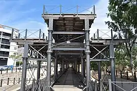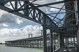 El muelle de la Compañía de Río Tinto, o «muelle del Tinto» como es conocido en Huelva a pesar de que está a orillas del río Odiel, tenía dos plataformas. Por la plataforma superior circulaban los trenes de minerales y por la inferior los de mercancías. Según el punto de su recorrido existían una, dos o tres vías férreas en sus distintos niveles. La primera parte elevada del muelle, aún en tierra, está realizada por completo en madera con pies derechos y vigas de gran sección arriostradas diagonalmente formando pórticos que se agrupan de dos en dos (veinte pares, siete de ellos de mayor anchura con tres vanos). Sobre las jácenas de estos pórticos descansan zapatas y durmientes que reciben la carga de las largas vigas longitudinales; sobre estas últimas apoyaban los raíles y se clavaba la tablazón del firme que a su vez se cubría con balasto.