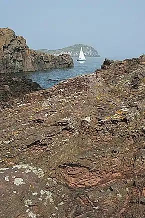 ![]() Flujo de lava de Mugearita (a la derecha); El flujo a la izquierda es hawaiita; En North Berwick, Escocia | ||