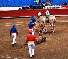 Para llevarse el toro, los mulilleros envuelven una cuerda alrededor de sus cuernos y lo atan a la barra de tracción para sacarlo de la plaza.