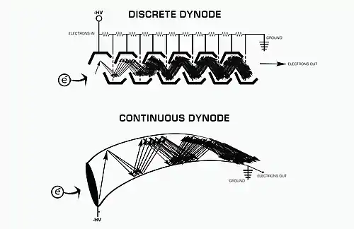 Un sistema de dinodo continuo utiliza un embudo de vidrio en forma de cuerno recubierto con una fina película de materiales semiconductores. Los electrodos tienen una resistencia creciente para permitir la emisión secundaria. Los dinodos continuos usan un voltaje alto negativo en el extremo más ancho y van a un positivo cercano a tierra en el extremo estrecho. El primer dispositivo de este tipo se denominó Multiplicador de electrones de canal (CEM). Los CEM requerían de 2 a 4 kilovoltios para lograr una ganancia de 10 6 electrones.