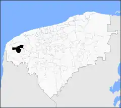 La cabecera municipal está a una distancia de 34 kilómetros de la ciudad de Mérida, capital del estado de Yucatán, en dirección suroeste. Limita con los siguientes municipios: al norte con Tetiz al sur con Maxcanú y Samahil, al oriente con Samahil y al poniente con el municipio de Celestún.
