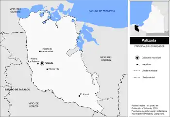 - Instituto Nacional de Estadística y Geografía (2005). «Prontuario de información geográfica municipal de los Estados Unidos Mexicano: Palizada, Campeche». Consultado el 2010. (enlace roto disponible en Internet Archive; véase el historial, la primera versión y la última).