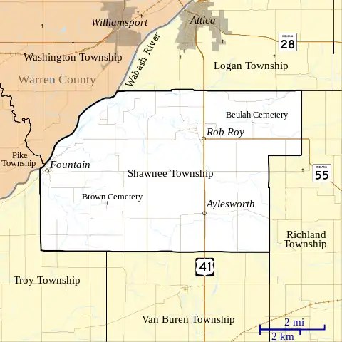 ![]() Ubicación de Shawnee Township entre las subdivisiones administrativas del condado de Fountain, Indiana | ||
