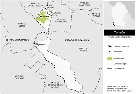 El municipio de Torreón tiene un total de 59 localidades, las principales y su población en 2020 son las siguientes:[14]