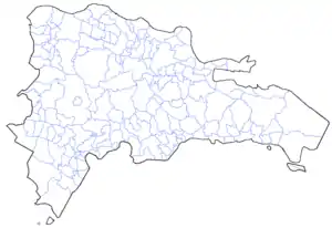 La República Dominicana consta (situación de 2021) de 158 municipios[14] con 235 distritos municipales.[15][16] Sus números pueden cambiar rápidamente debido a las elevaciones de distritos municipales a municipios, fusiones o separaciones municipales. La siguiente lista incluye los 155 municipios de la Revisión Territorial de 2015[17] más Baitoa (Santiago), Matanzas (Peravia) y San Víctor (Espaillat), que han sido añadidos posteriormente por elevaciones.