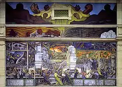 Rivera también incorporó elementos como imágenes de altos hornos que fabricaban mineral de hierro, fundiciones que fabrican moldes para piezas, cintas transportadoras que llevan las piezas fundidas, operaciones de mecanizado e inspecciones. Rivera representó todo el proceso de fabricación en el gran mural del lado norte. En el lado derecho e izquierdo retrató la industria química: yuxtaponiendo científicos que producen gas venenoso para la guerra y científicos que producen vacunas para fines médicos.