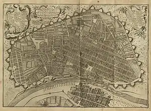 Plano de Lima de 1744 donde se aprecia la muralla rodeando la ciudad.