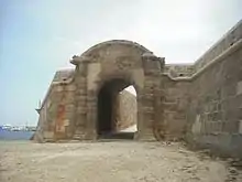 - Puerta de Tierra, de Alicante o de San Miguel (Porta de Terra, d'Alacant o de Sant Miquel): Es la menor y se abre a una pequeña cala en la que se encontraba el puerto,[3] del que sólo queda constancia por el reducido espigón formado por la roca natural.[1] No tuvo ninguna protección externa y sobre ella se situó uno de los bastiones más importantes de la ciudad, el del Príncipe. Se hizo en orden rústico almohadillado con unos capiteles hoy perdidos que apeaban unos pulvinos muy desdibujados sobre los que arranca un sencillo frontón curvo, vertebrado a modo de peineta.[4]